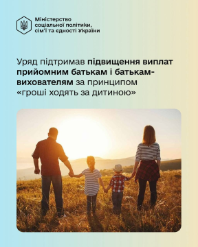 Уряд підтримав підвищення виплат прийомним батькам і батькам-вихователям. Йдеться саме про грошове забезпечення, спрямоване на підтримку їхньої праці та виконання обов'язків.