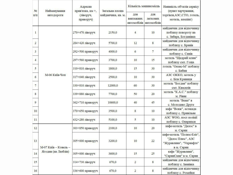 Для забезпечення безпеки дорожнього руху визначено пункти відстою вантажівок, зокрема на автодорозі М-06 та М-07. Вони розташовані поблизу населених пунктів Синів, Гоща, Бабин, Біла Криниця, Квасилів, Рівне, Молодово Друге, Привільне, Опарипси, Сарни та інших.